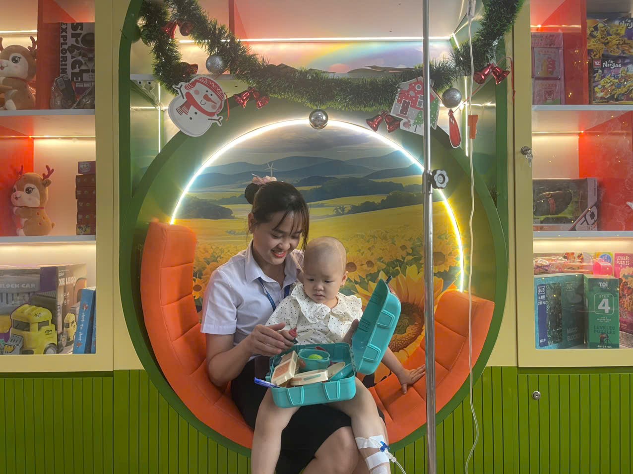 Trong suốt quá trình điều trị, khi trẻ hợp tác uống thuốc, tiêm – truyền dũng cảm, giữ vệ sinh cá nhân, ăn uống đúng giờ…, các con sẽ được tặng sticker tích điểm. Khi đủ điểm, trẻ được tự tay mở “Tủ quà yêu thương” để chọn phần quà mà mình yêu thích: hộp màu, đồ chơi xếp hình, sách truyện, thú bông, ba lô nhỏ…